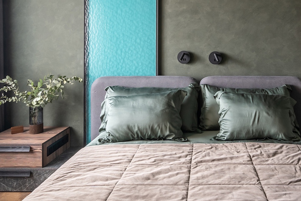 Вода. За изголовьем кровати разместили стеклянную панель с подсветкой. Вдохновившись озером Севан, с его чистейшей лазурной водой, придумали такой декоративный элемент, который одновременно будет выступать в роли ночника.