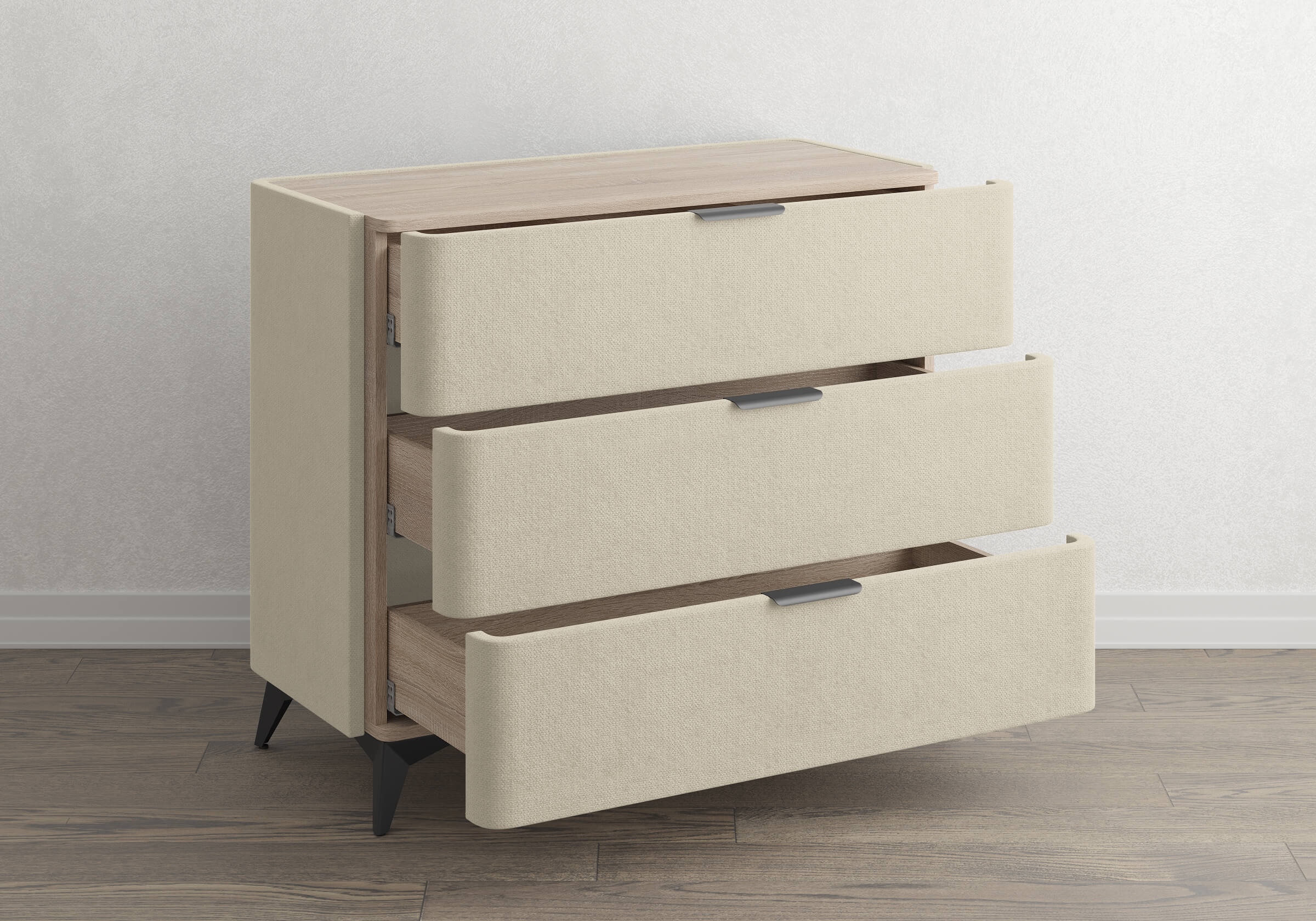 Комод Sheldon — образец слияния функциональности и эстетики. Поверхность, выполненная из ЛДСП в цвете «Дуб Сонома», создает контраст с мягким корпусом. Изящные металлические ручки и высокие металлические ножки подчеркивают его утончённый дизайн. Ящики на скрытых направляющих оснащены доводчиками, обеспечивая мягкое закрывание, а скруглённые углы добавляет стиля и удобства.