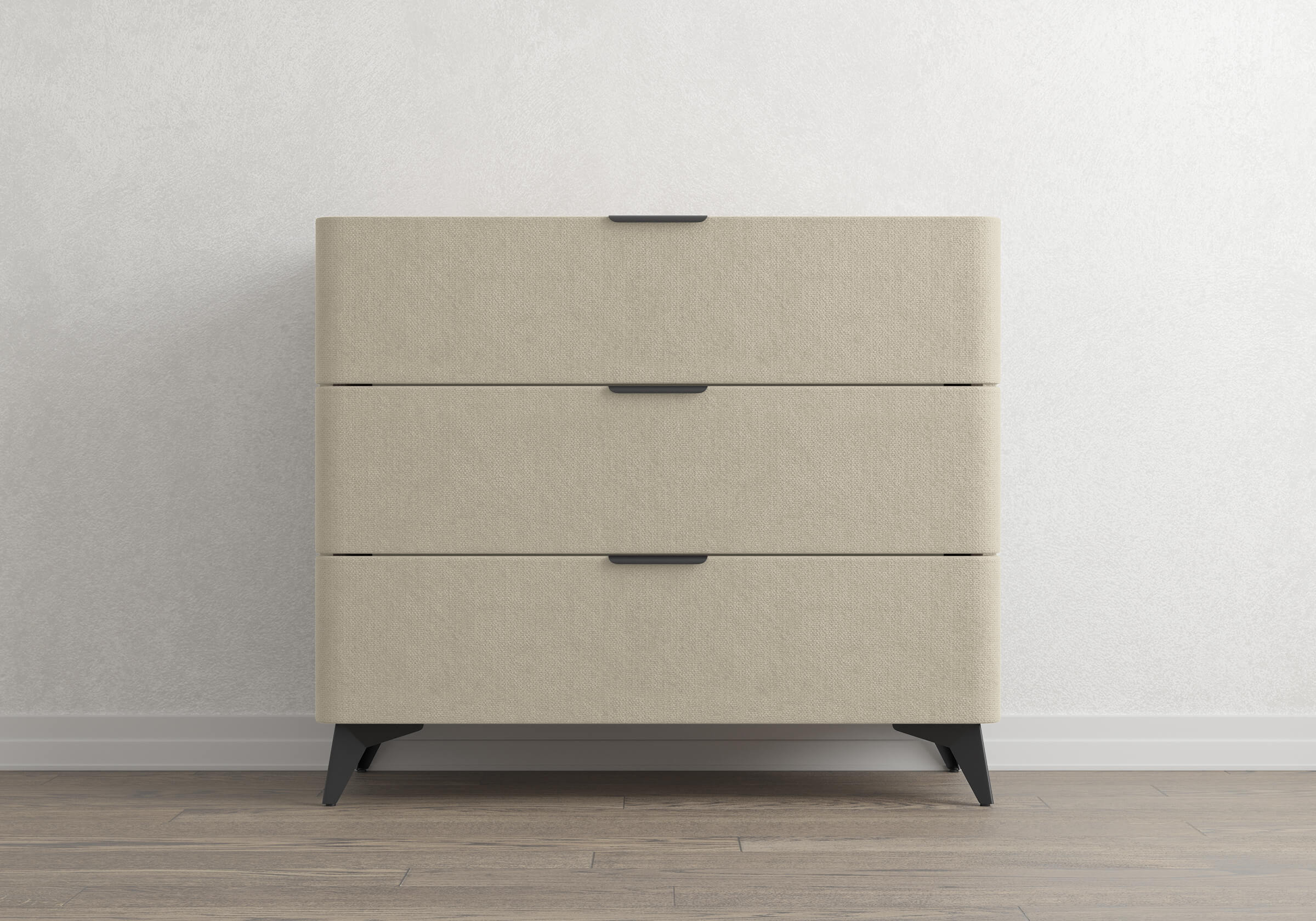 Высокие черные металлические ножки придают комоду не только устойчивость, но и особую выразительность. Этот элемент дизайна подчеркивает современный стиль мебели, добавляя ей элегантность.